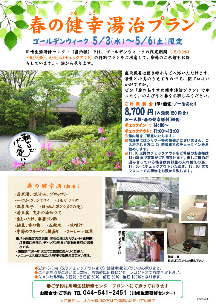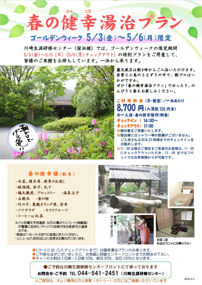 志楽の湯の宿泊棟である川崎生涯研修センターでは、ゴールデンウィークの限定期間( 5/3〜5/5、5/6チェックアウト)の特別プランをご用意して、皆様のご来館をお待ちしています。一泊から承ります。