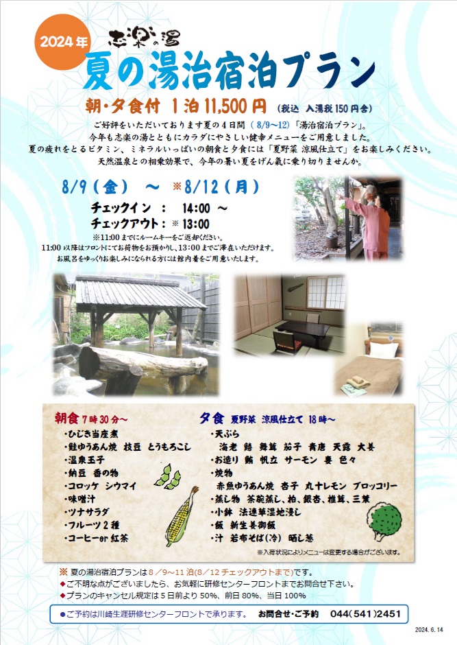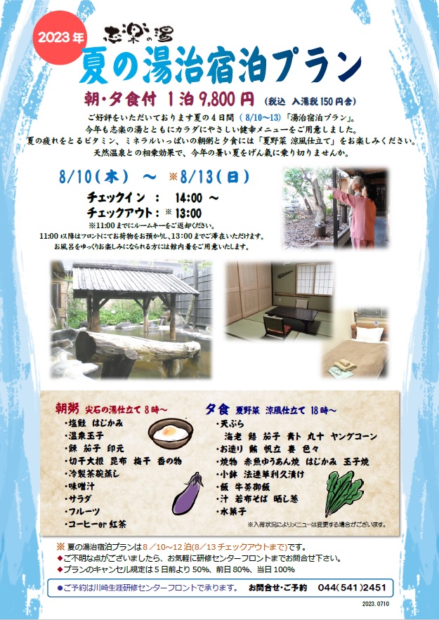 志楽の湯に隣接している川崎生涯研修センター(宿泊棟)では、ご好評をいただいております夏の4日間( 8/9〜12)「湯治宿泊プラン」を実施いたします。今年も志楽の湯とともにカラダにやさしい健幸メニューをご用意しました。夏の疲れをとるビタミン、ミネラルいっぱいの朝粥と夕食には「夏野菜 涼風仕立て」をお楽しみください。天然温泉との相乗効果で、今年の暑い夏をげん氣に乗り切りませんか。